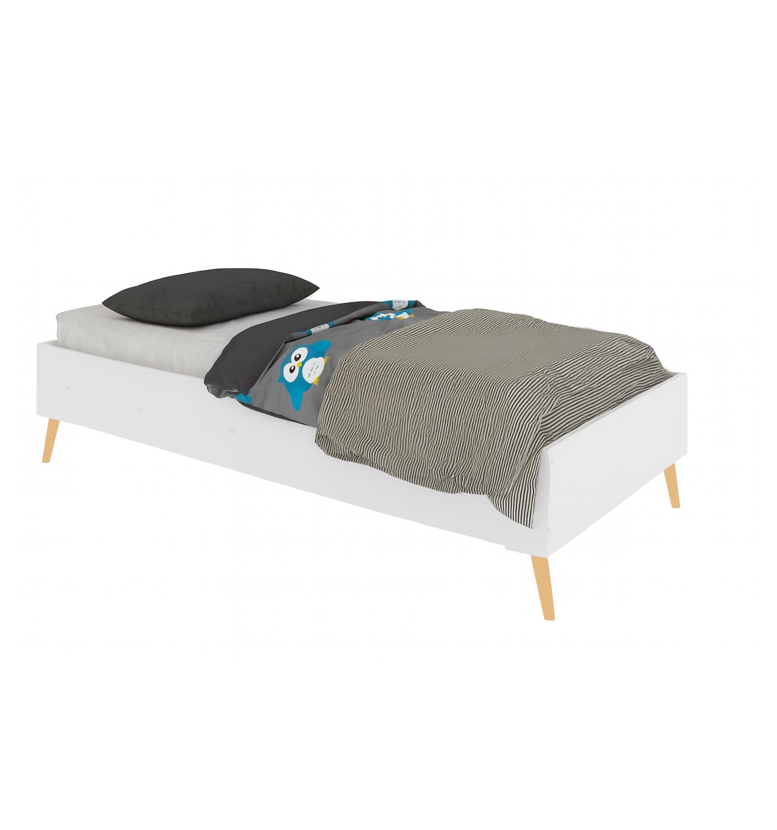 Esta cama infantil destaca-se pelos seus pés de estilo retro em madeira natural, que não só proporcionam estabilidade, mas também adicionam um contraste quente e sofisticado ao conjunto. Inclui uma base com ripas longitudinais de madeira, garantindo um suporte adequado e duradouro para um descanso confortável e saudável.