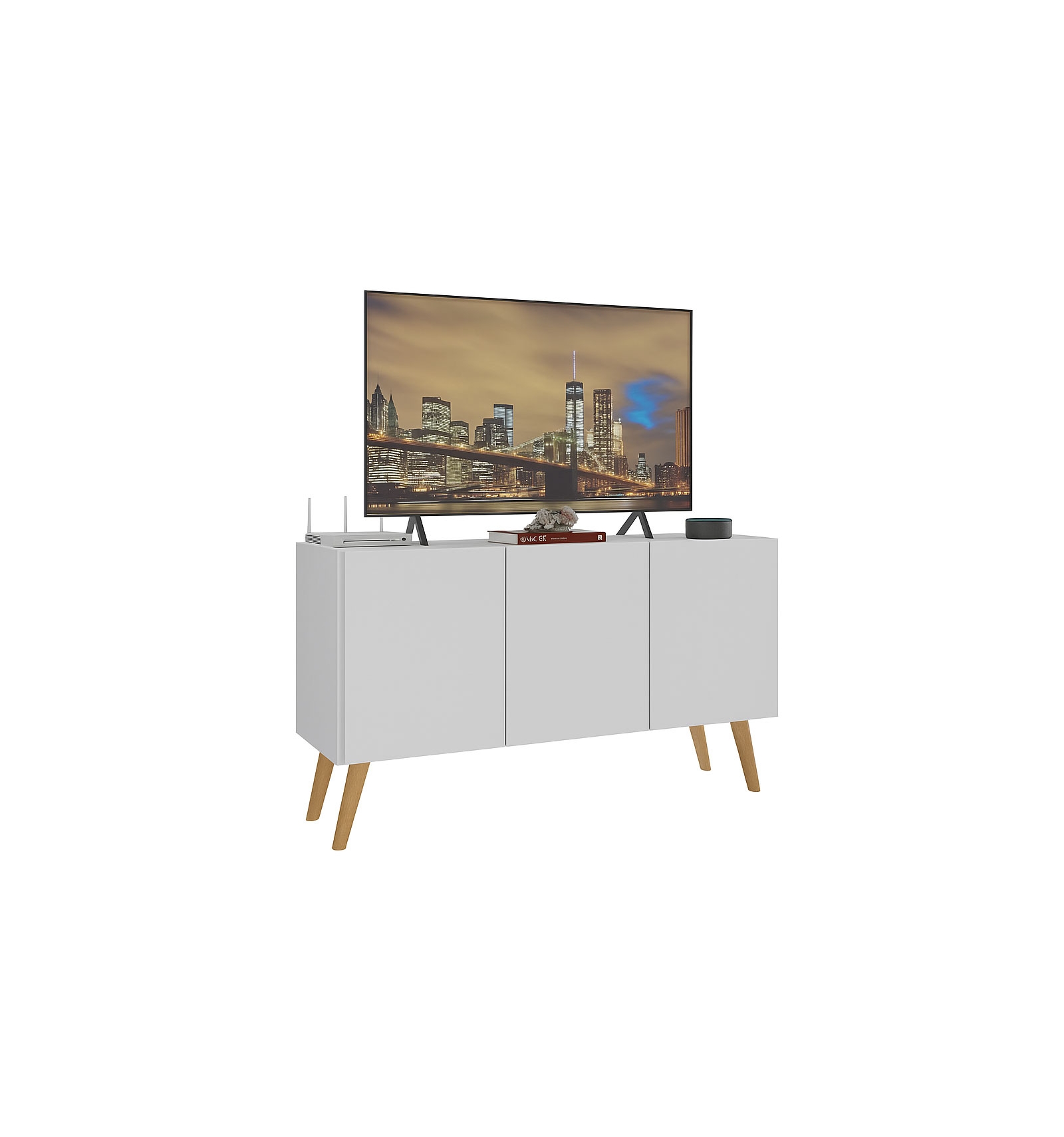 Este sofisticado móvel de TV com 3 portas, fabricado em MDP de alta qualidade com acabamento branco, combina um design minimalista com um toque retro único.